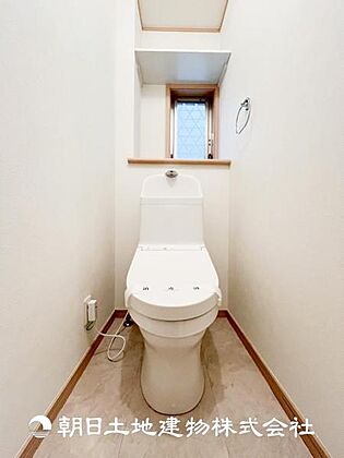【トイレ】家族みんなが毎日使う場所だから。お掃除がしやすい方はいい。いつまでも清潔な空間を保てるように、汚れをふき取り易いフロアと壁紙をチョイス致しました。洗浄便座になっておりますので、とても清潔にご