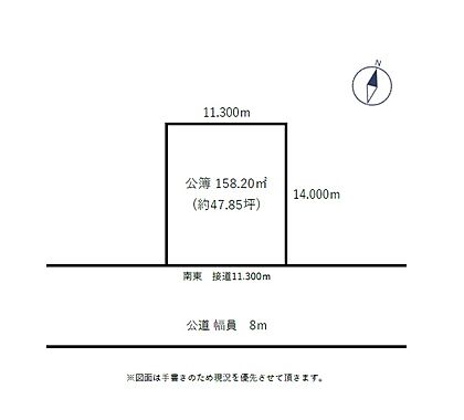 | 土地面積/坪(坪単価) | 158.20m2(登記簿)/47.94坪(30.20万円) | 代表的な接道 | 一方 公道 南東 8m ※詳細は備考欄をご確認ください |