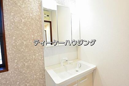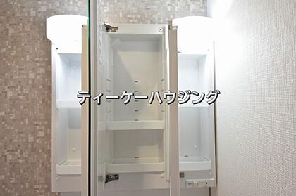 •  三面鏡の裏には収納がたっぷり。洗面室をすっきりきれいに使えます。