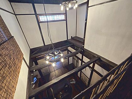 二階から見た吹き抜け部。梁と照明が素敵です♪