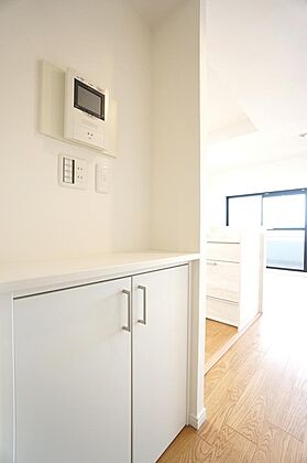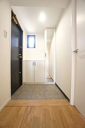 姿鏡、シューズボックス付きの玄関になります♪鏡裏にも収納がございます♪