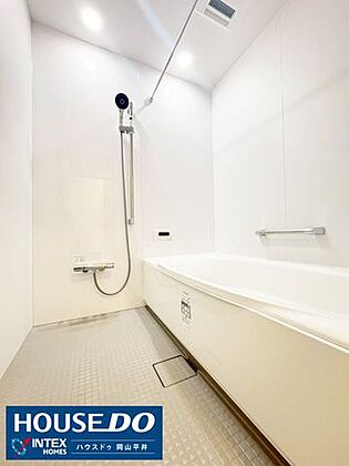 ゆったりサイズの浴槽は、お子様と一緒に足を伸ばして入れる広さ!白を基調とした壁と床で清潔感あふれる空間なので、一日の疲れをリフレッシュする至福のバスタイムが過ごせますよ。