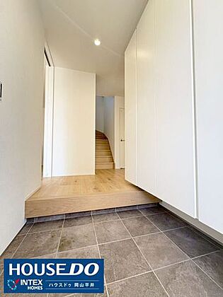 大容量のシューズボックスで玄関はいつもスッキリ!天然木の温もりと、スタイリッシュなタイルが家族を迎えてくれます。