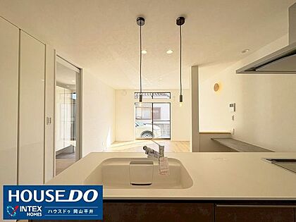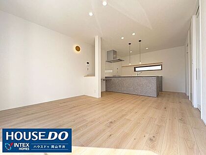 キッチンに立ちながら、リビングで遊ぶお子様の様子が見渡せる安心の間取りです!ペンダントライトがおしゃれな空間を演出し、家族の会話が自然と弾む、広々としたLDKが魅力的ですね。