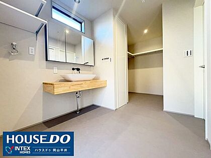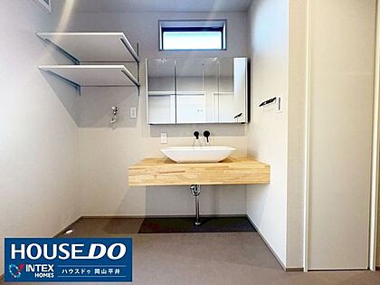 おしゃれな木目のカウンターと洗面ボウルが目を引く、洗練されたサニタリースペース!忙しい朝、家族が並んでもストレスなく使える広さが魅力です。奥には大容量の収納スペースも完備していますよ!