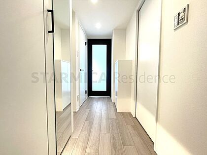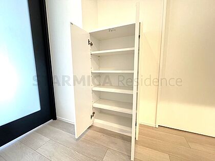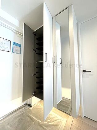 下足入れの横には全身鏡付きで身だしなみチェックができます