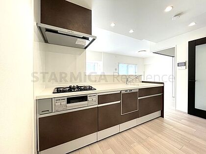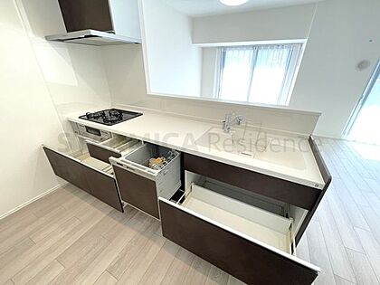 スタイリッシュなデザインのキッチン回り、収納も豊富で綺麗な空間を保てます