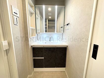 3面鏡内収納庫付で散らかりがちな洗面ボウルまわりもスッキリ