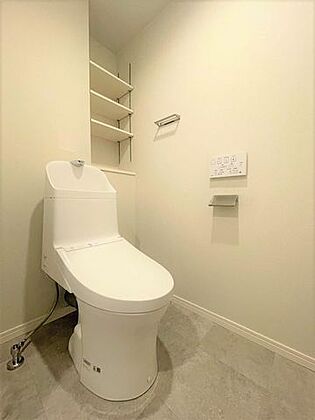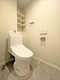 ウォシュレット機能付きのトイレは壁掛けリモコンの上位グレードを採用。便座がスッキリした印象となり、限られた空間を広く見せる効果があります。