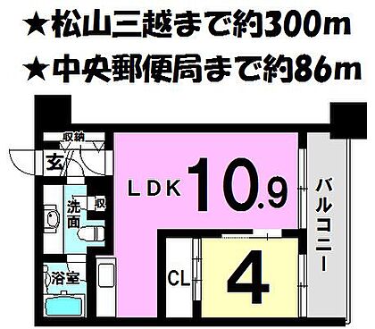 | 備考 | ★いよてつ?島屋まで約650m★松山三越まで約300m★セブン-イレブン 松山中央郵便局前店まで約160m★ドン・キホーテ 松山大街道店まで約300m | ||