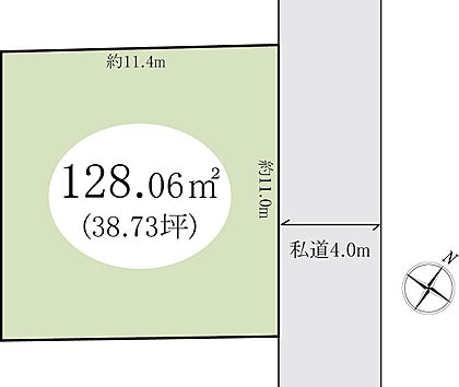 | 土地面積/坪(坪単価) | 128.06m2(登記簿)/38.81坪(33.00万円) | 代表的な接道 | 一方 私道 北東 4m ※詳細は備考欄をご確認ください |
