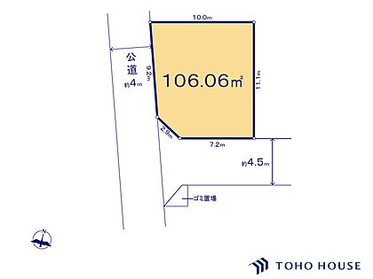 | 土地面積/坪(坪単価) | 106.06m2(登記簿)/32.14坪(86.80万円) | 代表的な接道 | 角地 公道 西 4m、南 4.5m ※詳細は備考欄をご確認ください |