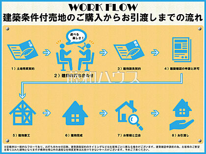 【建築条件付売地ご購入からお引渡し迄のワークフロー】間取りや内外装(キッチンや壁の色、外観デザイン等)を条件内でセレクト可!お客様のご要望をもとに提案やサポートを行い、オンリーワンのマイホームを実現!