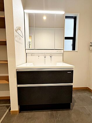 【洗面台】 洗髪・洗面・化粧などができる機能と収納スペースを一体化した洗面台です。