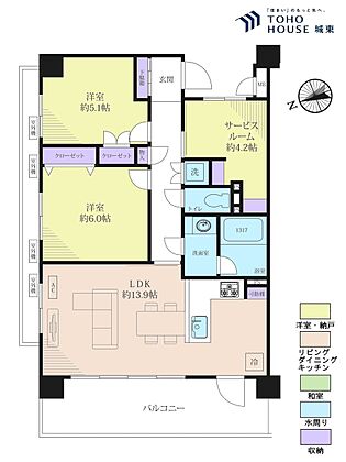 2SLDK、専有面積63.70平米、バルコニー面積12.42平米
