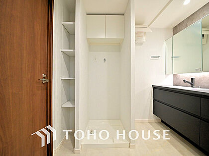 白を基調とした清潔感のある洗面室で朝の身支度を