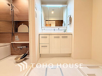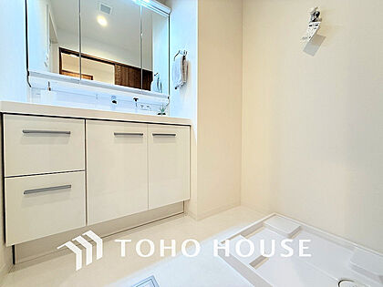 白を基調とした清潔感のある洗面室で朝の身支度を