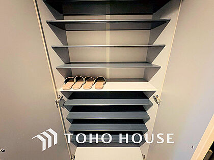 天井まである玄関収納はご家族分の履物も余裕で収納可能