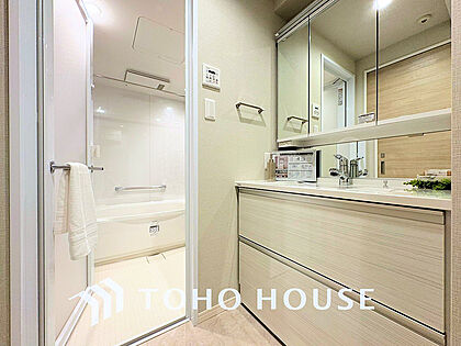 白を基調とした清潔感のある洗面室で朝の身支度を