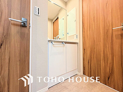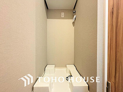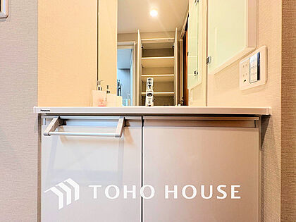 白を基調とした清潔感のある洗面室で朝の身支度を