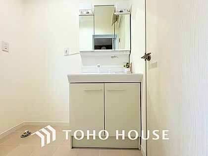 洗面台には三面鏡を採用。身だしなみを整えやすく収納量も良好です
