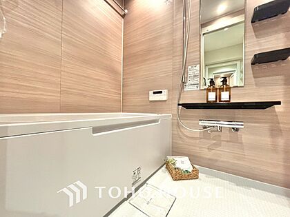 【浴室】《一日の疲れを落としてくれる場所は、落ち着く場所でなければならない》 高級感溢れるカラーと大きさ・柔らかな曲線で構成された半身浴も楽しめるバスタブが心地よさをもたらします。