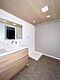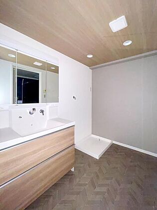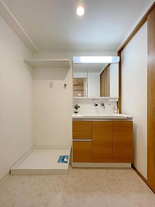 明るく清潔感のある色調で纏められた洗面室は、機能性に富んだ三面鏡の洗面台と採光窓が特徴です♪通気性もよく、洗濯機置場も完備し、家事の動線も配慮されたデザインになっております。