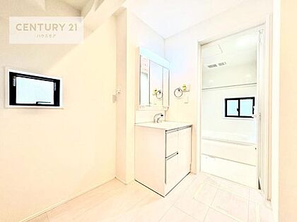 三面鏡仕様の洗面所は、身だしなみがしやすい造り!裏は収納になっています。ドライヤーやお化粧道具を片付けられるので洗面台周りをスッキリと見せることが出来ます!