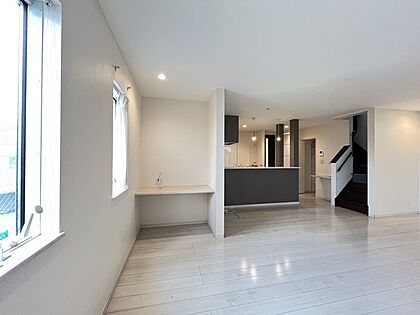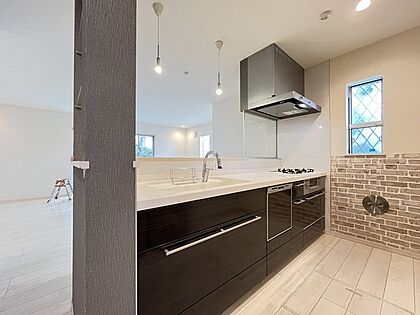 リビングにいる家族の顔が見渡せるカウンターキッチン。お料理もより一層おいしく、楽しく。食器棚を背面に設置しても十分な広さを確保しています。