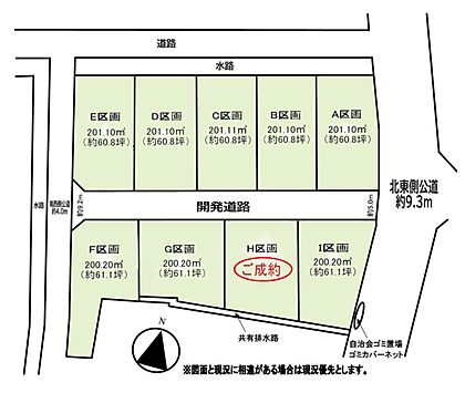 区画図:全9区画:陽当たり良好な広々とした区画。