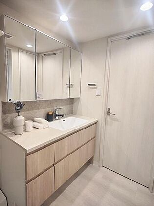 収納を兼ね備えた大きな三面鏡の洗面化粧台