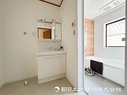 【洗面化粧台】広々とした洗面化粧台はたっぷり収納もさるますし、朝の忙しい時間でも心に余裕とゆとりを作ってくれます。