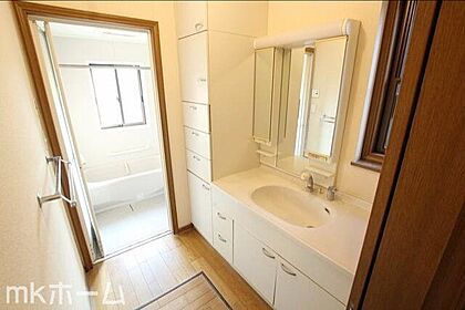 大きな鏡と洗面台が付いた洗面化粧台は収納も豊富!買い置きした日用品などまとめて収納する事が出来ます!
