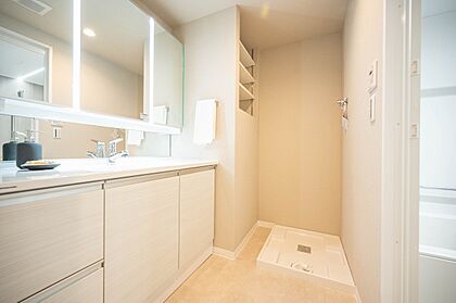 3面鏡裏収納など収納豊富な洗面化粧台とゆとりの脱衣スペース