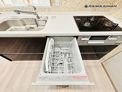 ビルトイン食洗機と三口コンロで、家事も時短&快適。スタイリッシュな中にも、暮らしやすさをしっかり備えています。