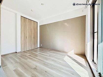 ナチュラルな木目と落ち着きあるアクセントクロスが心を和ませる洋室。大きな窓から差し込む陽光が、毎日を明るく包みます。