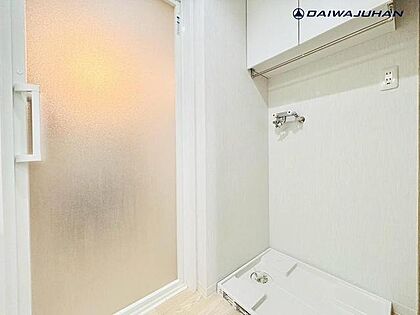 洗濯機置き場もスッキリと設計。上部収納が付いていて、洗剤や日用品もスマートに収納できます。