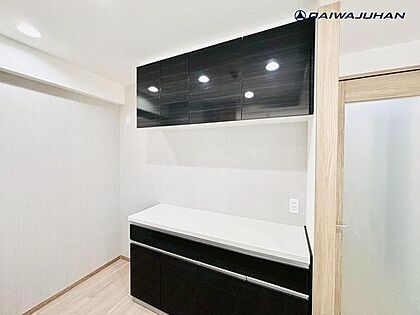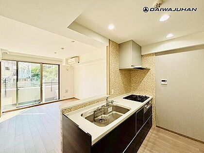 艶やかなダークカラーのキッチンと、優しい光が差し込むリビング。美しさと実用性を兼ね備えた理想の住空間です。