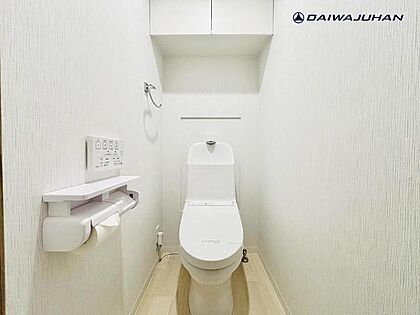 白を基調にした清潔感あるトイレ空間。上部収納もあり、すっきり整った印象をキープできます。