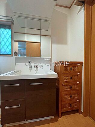 洗面台にはシャワー付き♪三面鏡ですのでお鏡も広くお使い頂けます。