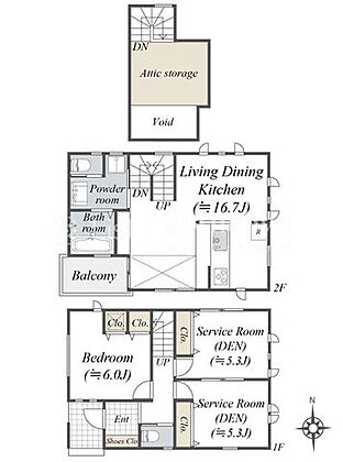 ◆外観◆駐車2台可能!(車種による)2階建てのお住まいでLDKが2階になります!全居室収納付きでさらに小屋裏収納付き!2階に水回りがまとまり家事動線が考えられています!