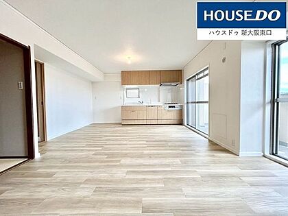 天井も高く開放感があります。大きめのダイニングテーブル。家族でくつろげるソファーセットが設置できますね。