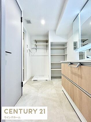 ゆったりサイズの洗面スペース!リネン類や洗濯用品などが片付く可動棚があるので、スッキリとした洗面周りになります!