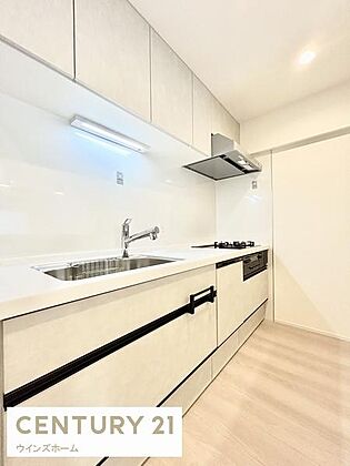 カウンターキャビネットが備え付けられ、調理器具や食器をスッキリ整理できます。家事動線を考慮した快適な設計が魅力です。