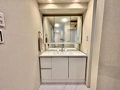 三面鏡の付いた洗面化粧台は、鏡面裏側にも機能的な収納を配置。普段使いの洗面小物やスキンケア用品などが衛生的に保管できます。