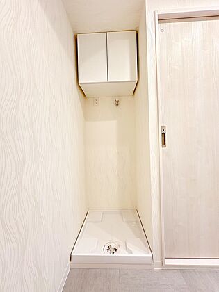 洗濯機置場。上部には吊戸棚があり、消耗品を収納できます