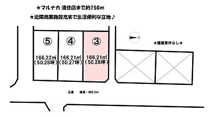 土地面積/坪(坪単価) 166.21m2(登記簿)/50.37坪(27.90万円) 代表的な接道 一方 公道 東 8.2m