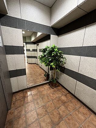 共用廊下には観葉植物や鏡が配置され、落ち着いた雰囲気が感じられます。