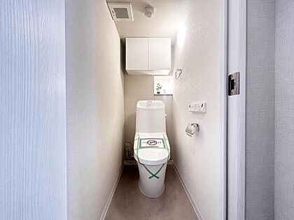 【トイレ】収納付きで、トイレットペーパーや掃除道具もすっきり収納できます。