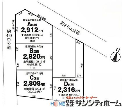 | 土地面積/坪(坪単価) | 100.11m2(実測)/30.34坪(92.90万円) | 代表的な接道 | 公道 西 4m ※詳細は備考欄をご確認ください |